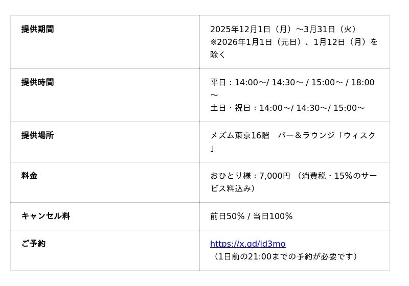 今回のアフタヌーンティープログラムで目指したのは名品の再現ではなく、“日本文化を味わう”ことです。ミニマルな造形の中に、季節と物語性を凝縮し、前菜とメインそれぞれに最適なペアリングモクテルをご用意しています。“TOKYO WAVES”をテーマに、アート・音楽・食・デザインが交差する独創的な体験を創出してきたメズム東京は、本コラボレーションを通じて、国内外のゲストに「五感で日本を再発見する時間」をお届けします。