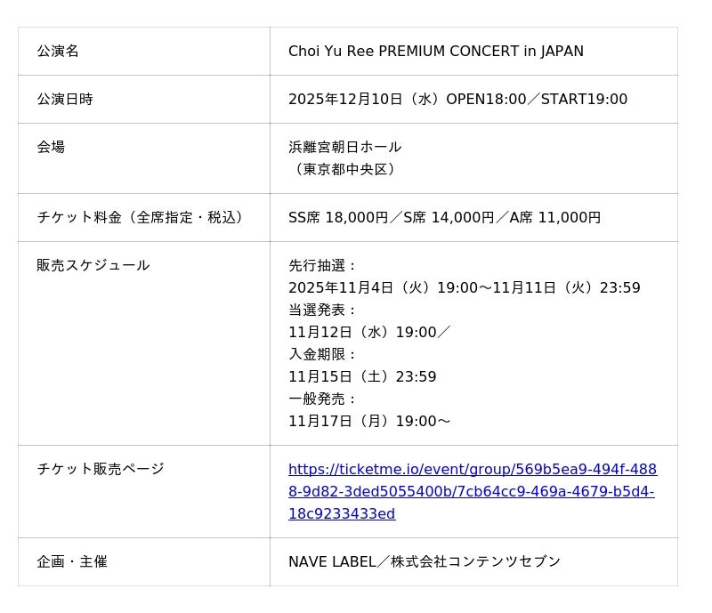 株式会社チケミー(本社:東京都港区、代表取締役:宮下大佑)が運営する電子チケットプラットフォーム「TicketMe(チケミー)」は、韓国の人気シンガーソングライター・チェ・ユリ(Choi Yu Ree) による日本初の単独公演「Choi Yu Ree PREMIUM CONCERT in JAPAN」のチケット先行抽選販売を2025年11月4日(火)19:00より開始いたしました。