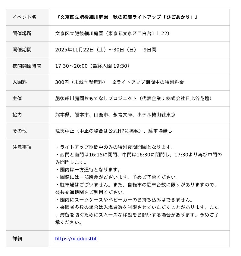 株式会社日比谷花壇(本社:東京都港区、代表取締役社長:宮島浩彰)は、当社が代表企業を務める肥後細川庭園おもてなしプロジェクト(共同事業体)で受託し、管理運営を行う「文京区立肥後細川庭園」(所在地:東京都文京区目白台1丁目1-22)において、2025年11月22日(土)から30日(日)までの9日間、夜間の特別ライトアップイベント『文京区立肥後細川庭園 秋の紅葉ライトアップ「ひごあかり」』を開催することをお知らせします。
