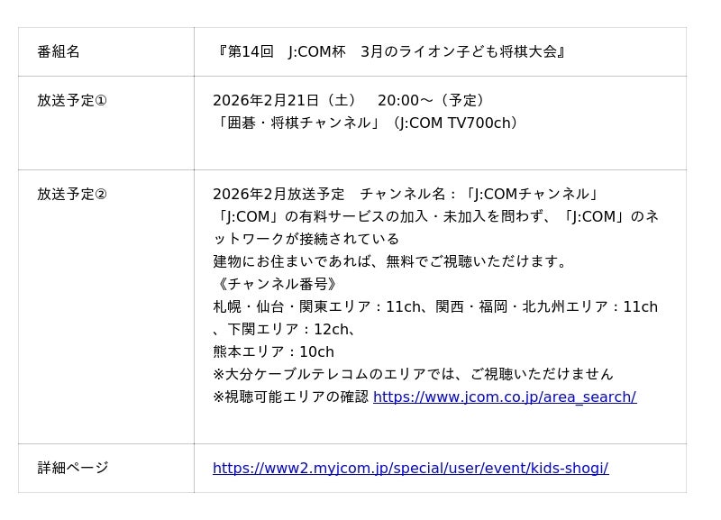 決勝戦の模様は2026年2月21日(土)20時より「囲碁・将棋チャンネル(J:COM TV 700ch)」、同月にJ:COMのコミュニティチャンネル「J:COMチャンネル」(地上デジタル11ch)で放送します。