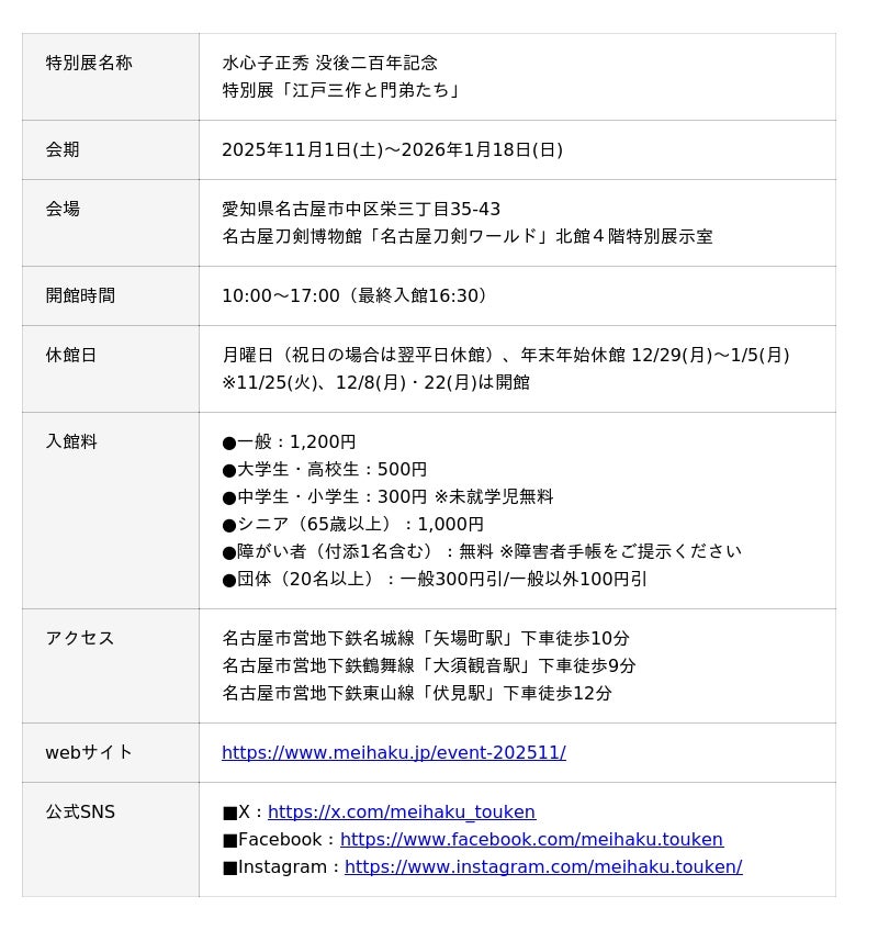 名古屋刀剣博物館「名古屋刀剣ワールド」(愛知県名古屋市、以下当館)では、2026年1月18日(日)まで、特別展「江戸三作と門弟たち」を開催しています。本展に合わせ、オリジナルのミュージアムグッズやイベントを開催。水心子正秀・大慶直胤・源清麿とその門弟たちによる刀の鑑賞とともに、グッズやイベントでも江戸三作の世界をお楽しみください。