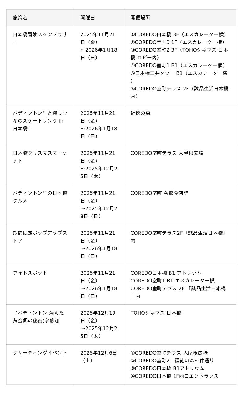 三井不動産株式会社(所在:東京都中央区、代表取締役社長:植田 俊、以下「三井不動産」)は、日本橋・室町エリアで展開する商業施設群「COREDO室町」(COREDO室町1・2・3、COREDO室町テラス、日本橋三井タワーの計5施設)、「COREDO日本橋」を中心に、2025年11月21日(金)~2026年1月18日(日)の期間中、イギリスの児童文学から誕生したキャラクター「パディントン(TM)」とのコラボレーション企画「パディントン(TM)の日本橋大冒険」を開催いたします。
