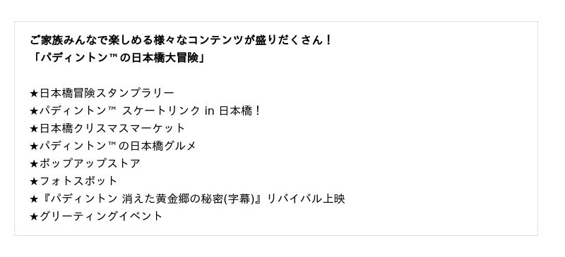 他にも、COREDO室町・COREDO日本橋の各エリアには、パディントン(TM)と一緒に写真が撮れるフォトスポットが登場するほか、1日限定でパディントン(TM)が日本橋のまちにやってくるグリーティングイベントを開催いたします。また「TOHOシネマズ 日本橋」では、『パディントン(TM) 消えた黄金郷の秘密(字幕)』をリバイバル上映。この冬、パディントン(TM)の可愛らしい世界観に包まれながら、是非とも日本橋の街で素敵な体験をお楽しみください。