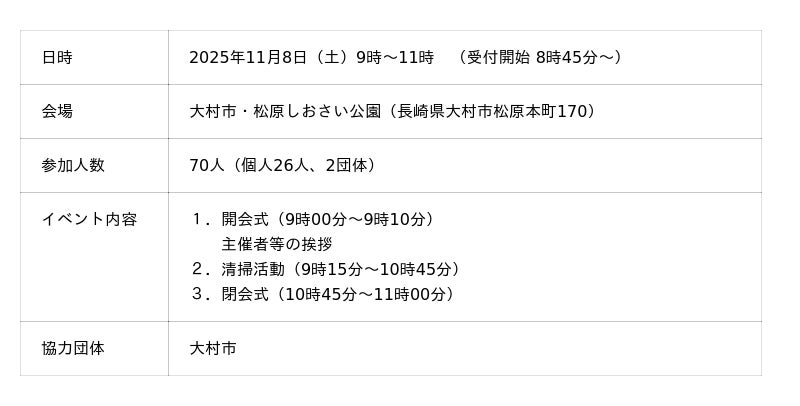 今回のイベントには、開催地・大村市だけでなく、長崎市や川棚町などでボランティア清掃に取り組む企業や団体、個人が参加しました。普段は、それぞれの地域で活動を展開していますが、今回のイベントを通じてお互いの活動やそれぞれの地域の現状、課題について意見交換する機会の創出にもつながりました。