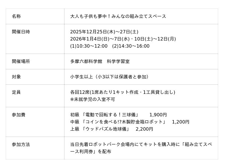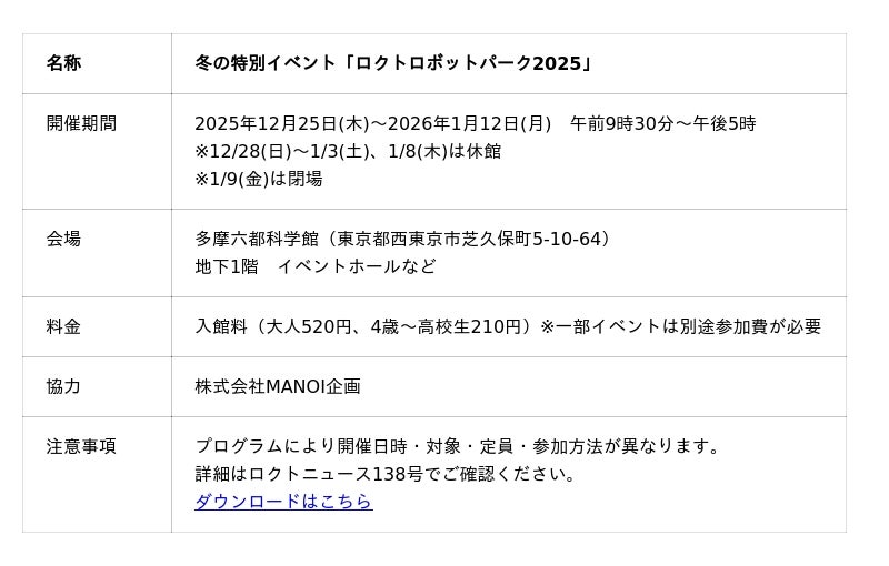 多摩六都科学館(東京都西東京市、館長:高柳雄一)では、毎年冬に好評をいただいている特別イベント「ロクトロボットパーク」を今年も開催いたします。