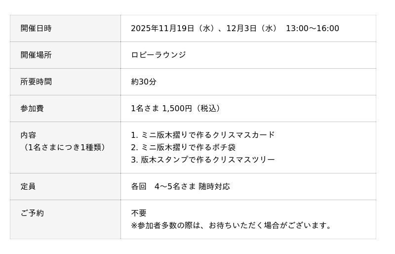京からかみとは、古くから伝わる文様を彫った版木に、雲母・胡粉・布海苔・顔料などを調合した絵具をのせ、手のひらで一枚一枚摺り上げた伝統装飾和紙。ロビーラウンジで展開するPOP UP STOREでは、美しい文様と質感を活かした京からかみのパネルや、和にも洋にも調和するあたたかな灯りの照明などを展示販売し、国内外のゲストに京都の伝統美にふれる機会をお届けします。また、11月19日(水)と12月3日(水)には、京からかみのミニチュア版体験キットや版木スタンプを用いた、クリスマスシーズンにぴったりのワークショップを開催します。文様に込められた意味や伝統の技にふれながら、京都の文化に想いを馳せる体験をお楽しみください。