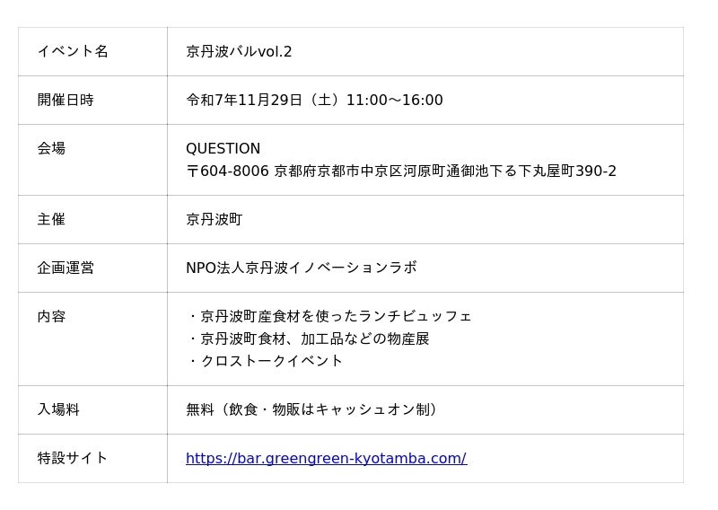 京丹波町(町長:畠中 源一)は、京丹波町の豊かな食材と人、そしてまちづくりの想いをつなぐイベント「京丹波バル vol.2」を令和7年11月29日(土)11時~16時、京都市のQUESTIONにて開催します。