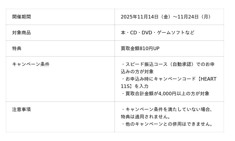 本・CD・DVD・ゲームソフトなどを対象に、期間中に宅配買取をお申し込みのうえ、キャンペーンコード【HEART11S】を入力された方に、買取金額を810円アップいたします。