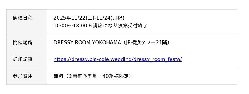 「PLACOLE & DRESSY」ブランドを展開する冒険社プラコレ(本社:神奈川県鎌倉市、代表取締役CEO:武藤功樹)は、横浜駅直結JR横浜タワー21F、ウェディングの魔法にかかる空間"DRESSY ROOM YOKOHAMA"にて、11/22(土)-11/24(月祝)の3日間限定で、これから結婚式をお考えのカップル様に向けた、個室相談やウェディングドレス試着ができる豪華特典付きのウェディング初体験フェスを開催いたします。(40組様限定、無料開催)