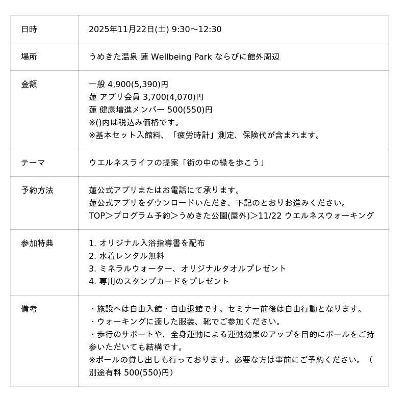 「うめきた温泉 蓮 Wellbeing Park」(総支配人:藤立 達哉、所在地:大阪市)は、ウエルネスツーリズムを研究する流通科学大学 人間社会学部観光学科 西村 典芳教授とタイアップし、うめきた公園周辺をウォーキングし、天然温泉をはじめとした施設利用を愉しむイベント「ウエルネスウォーキング」の第1回を11月22日に開催することをお知らせいたします。
