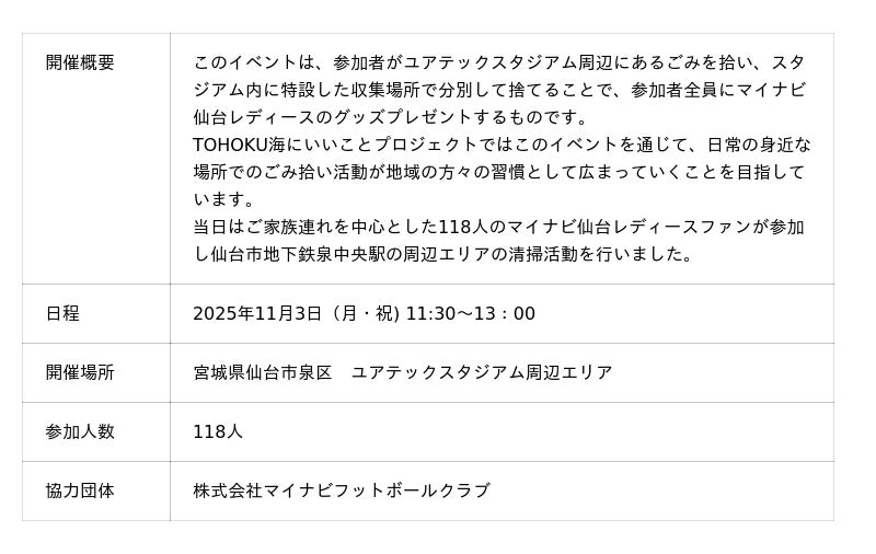 一般社団法人TOHOKU海にいいことプロジェクト(宮城海ごみなくし隊)は、2025年11月3日(月・祝)に生活の中での街のごみ拾い活動の習慣化を目的として、株式会社楽天野球団と連携した「ごみを拾ってマイナビ仙台レディースを応援しよう!」を開催いたしました。