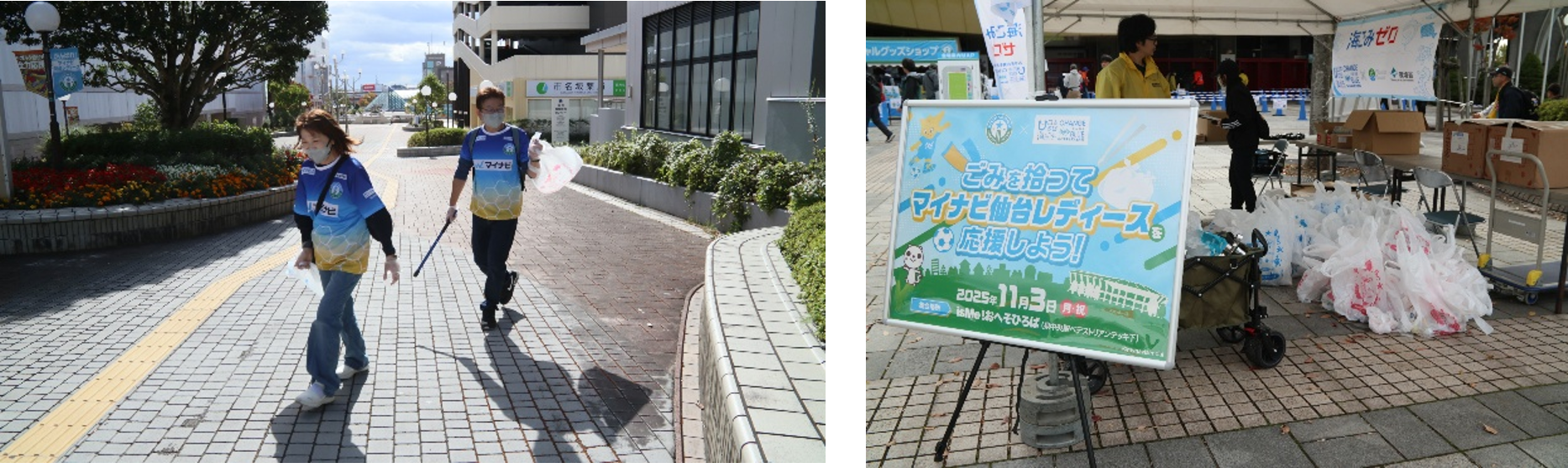 このイベントは、マイナビ仙台レディースの試合観戦に来た皆さんにホームスタジアムのユアテックスタジアム周辺のごみを拾うことで、馴染みのある場所での清掃活動を体験し、今後の習慣化につなげていただきたいというねらいもあります。