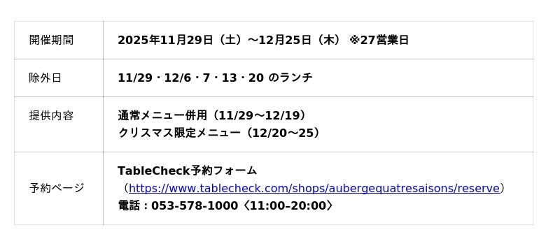 静岡・浜名湖を望むオーベルジュ「浜名湖オーベルジュ キャトルセゾン」(運営:株式会社スティルアン)は、2025年11月29日(土)~12月25日(水)の期間、27営業日にわたりアーリークリスマス&クリスマス限定コースを提供します。