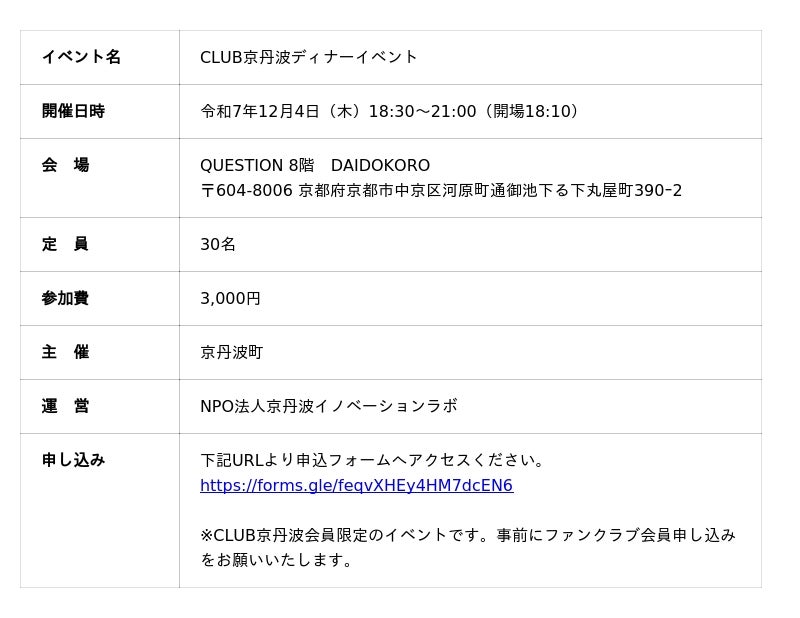 京丹波町(町長:畠中 源一)は、京丹波ファンクラブ「CLUB京丹波(くらぶきょうたんば)」初のリアル交流イベント『CLUB京丹波ディナーイベント』を、令和7年12月4日(木)に京都市のQUESTION 8階DAIDOKOROにて開催します。