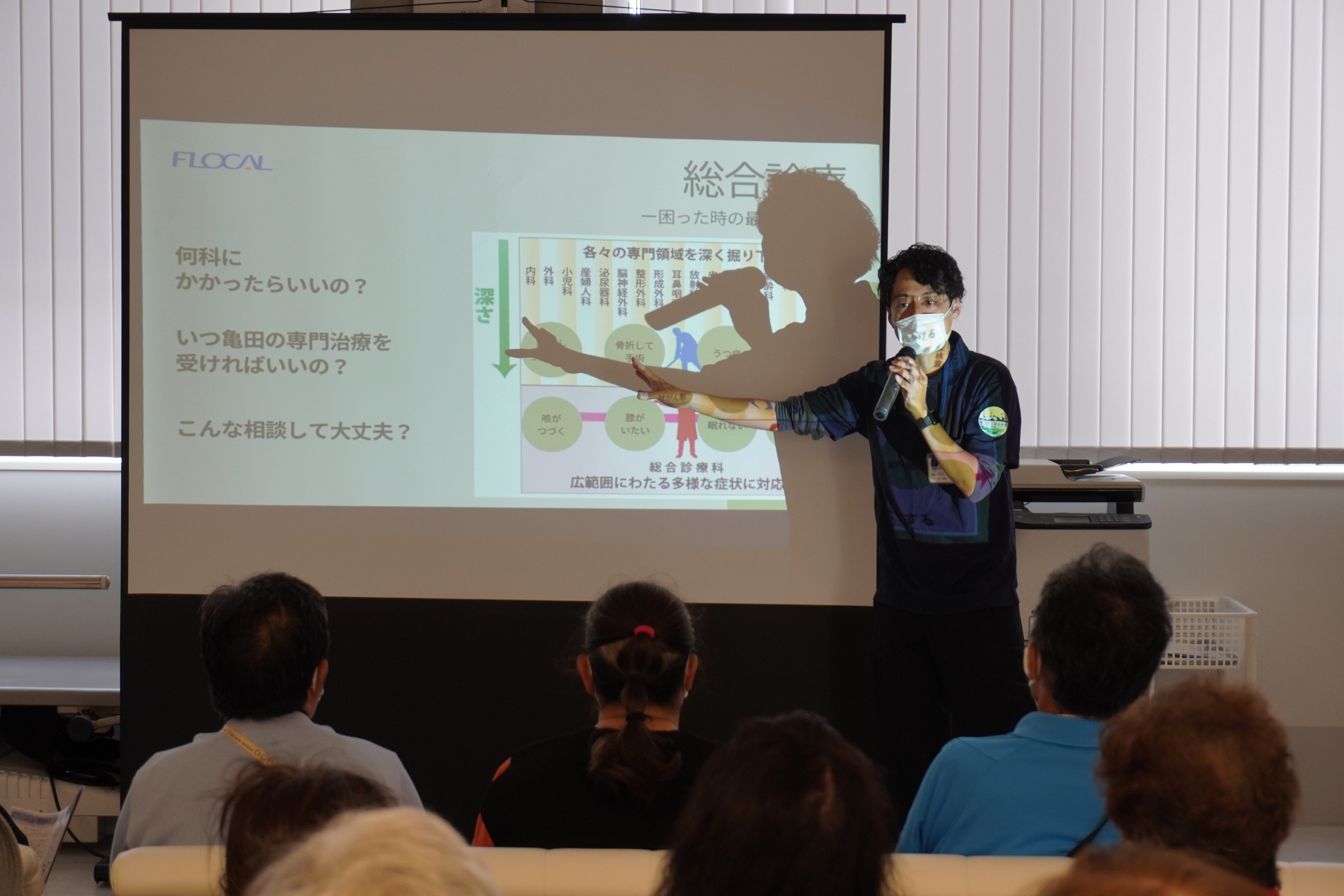 - 講演「鴨川地域での健康と医療体制~鴨国の使い方~」FLOCAL代表の日下が健康増進と地域の医療体制をテーマに講演を行いました。健康増進のために医療とどう関わるのか、実際に住民視点だと気づきにくい鴨川地域がいかに医療に恵まれているか、加えて全国的な病院や地方自治体の赤字が言われている中で医療を起点としたまちづくりの視点を共有しました。職員からは「外からきた医師が思いを持って頑張ってるから一層頑張らないといけない」という声や、参加住民からも「健康増進のためにどう医療と関わればいいのか分かりやすかった」との声をいただきました。