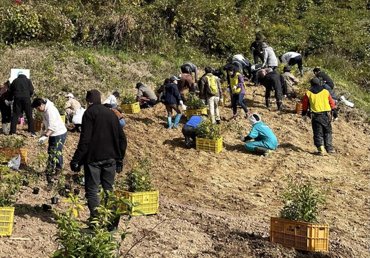 株式会社山田養蜂場(所在地:岡山県苫田郡鏡野町、代表取締役社長:山田英生)は、2025年11月15日(土)、岡山県鏡野町と津山市教育委員会の後援のもと、苫田郡鏡野町馬場にて「第9回 山田養蜂場 宮脇式植樹祭」を開催いたしました。宮脇式植樹は、横浜国立大学名誉教授の故・宮脇昭氏が提唱した「その土地の潜在自然植生にもとづく森づくり」の手法です。多様な樹種を高密度で植えることで、競争しながら成長する生命力の高い森が生まれ、約3年で人の手をほとんど必要としない自立した生態系が形成されます。