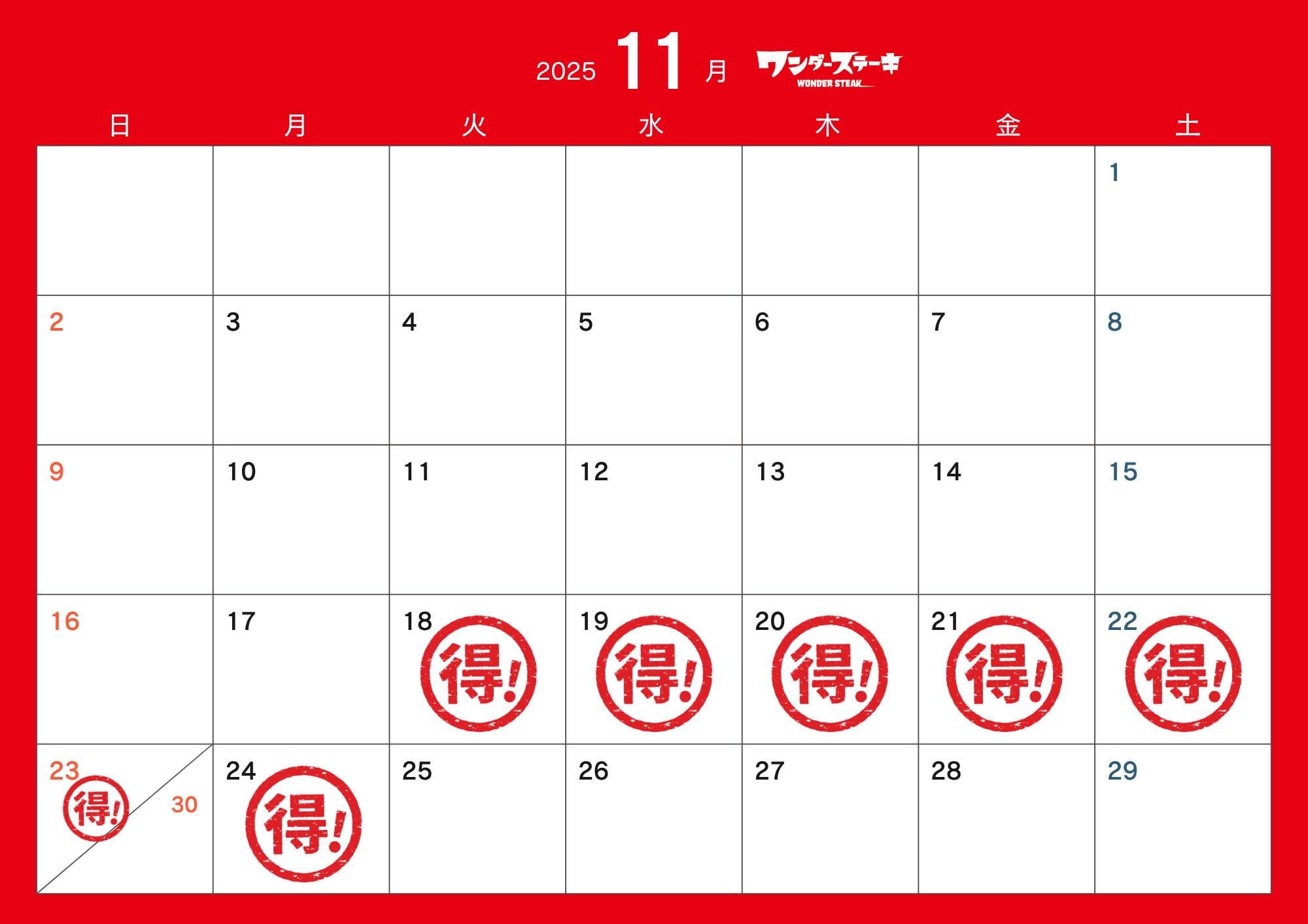 閉店大特価セール第2弾は、11月8日(火)~24日(日)までの7日間で実施致します。第1弾の「とろけるハラミカットステーキ閉店大特価」のイベントと合わせて、お得にワンダーステーキをお楽しみください。