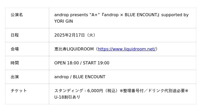 本公演は、andropが展開する自主企画ライブシリーズ“A+”で実施される、BLUE ENCOUNTとのツーマンライブです。YORI はスポンサードブランドとして企画に参画し、当日はクラフトジンの提供に加え、YORI の公式オンラインストアで使えるクーポンコードや、国産クラフトジン専門のカフェバー「COYORI」で利用できるクーポン券を来場者へ配布します。