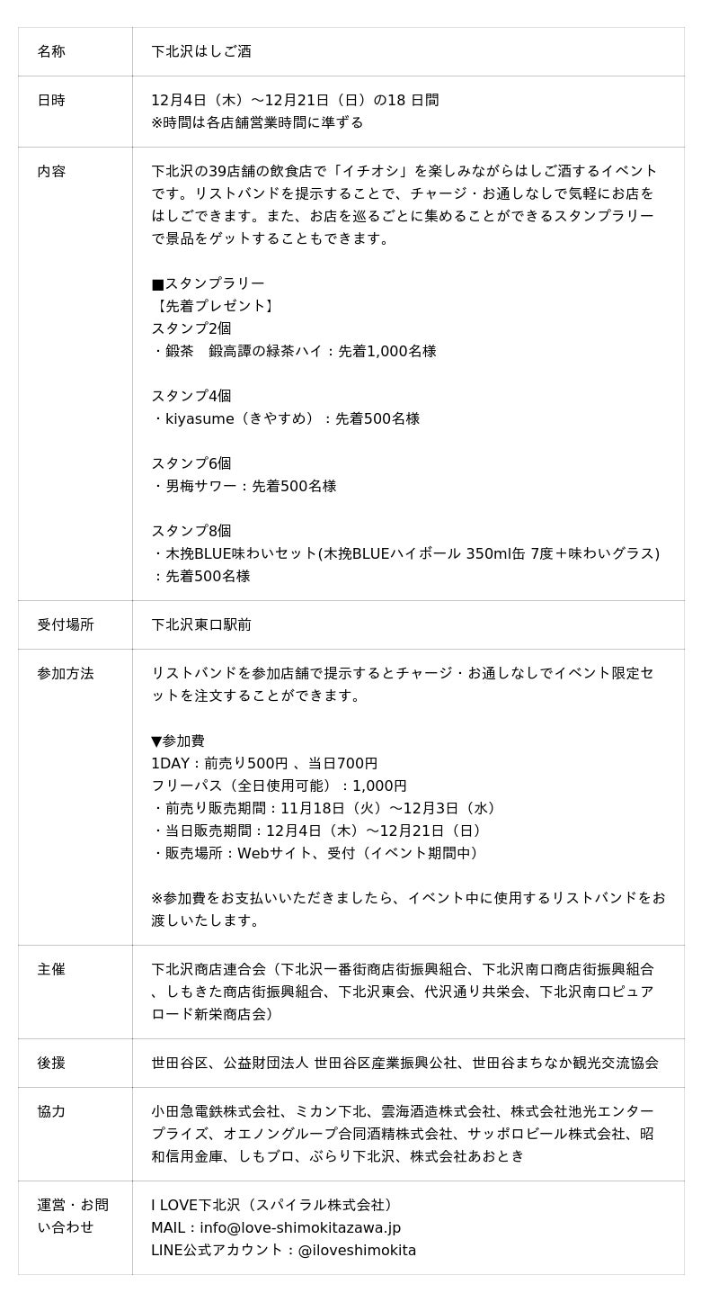 また、お店を巡るごとに景品がもらえるスタンプラリーも実施いたします。ノンアルコールメニューもご用意しているため、お酒が飲めない方もご参加いただけます。気になるお店をはしごしながら、下北沢でしか味わえないおいしい出会いを、ぜひお楽しみください。