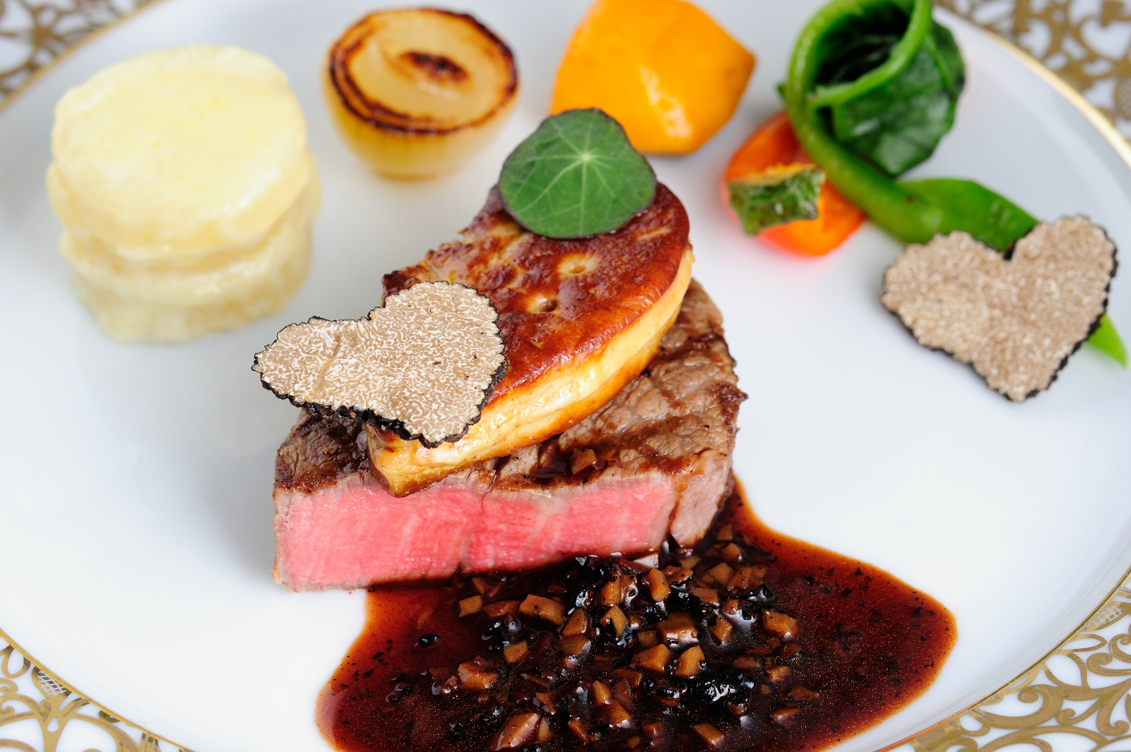 オマール海老を使用した彩り豊かな前菜や「黒毛和牛フィレ肉とフォアグラのロッシーニ」など、見た目も味わいも華やかな本格フレンチコース。