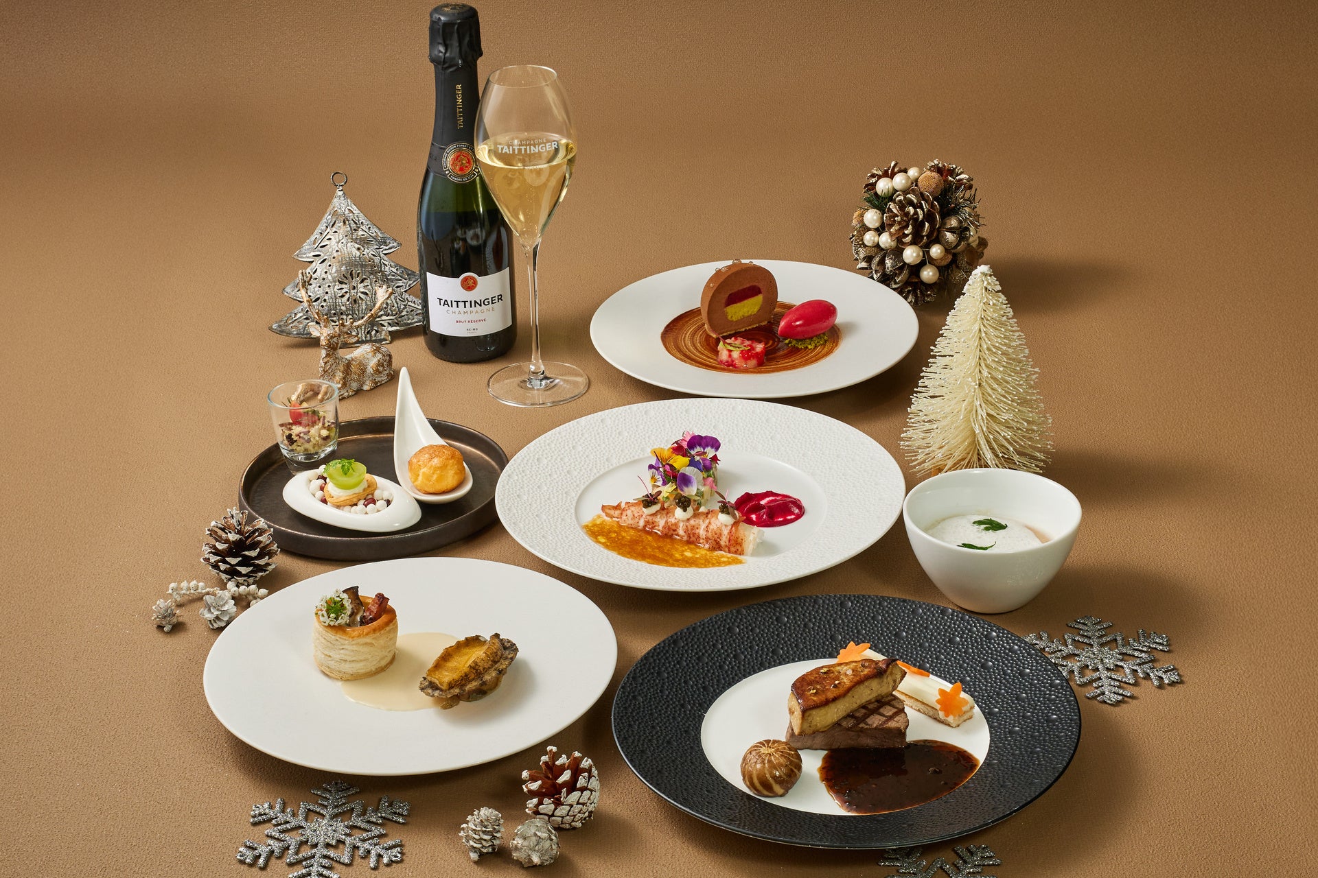 大きな窓に広がる夜景が美しい、ホテル最上階のレストラン。メインは佐賀牛フィレにフォワグラのソテーを添えた贅沢フレンチで、心満たすクリスマスのひとときを。