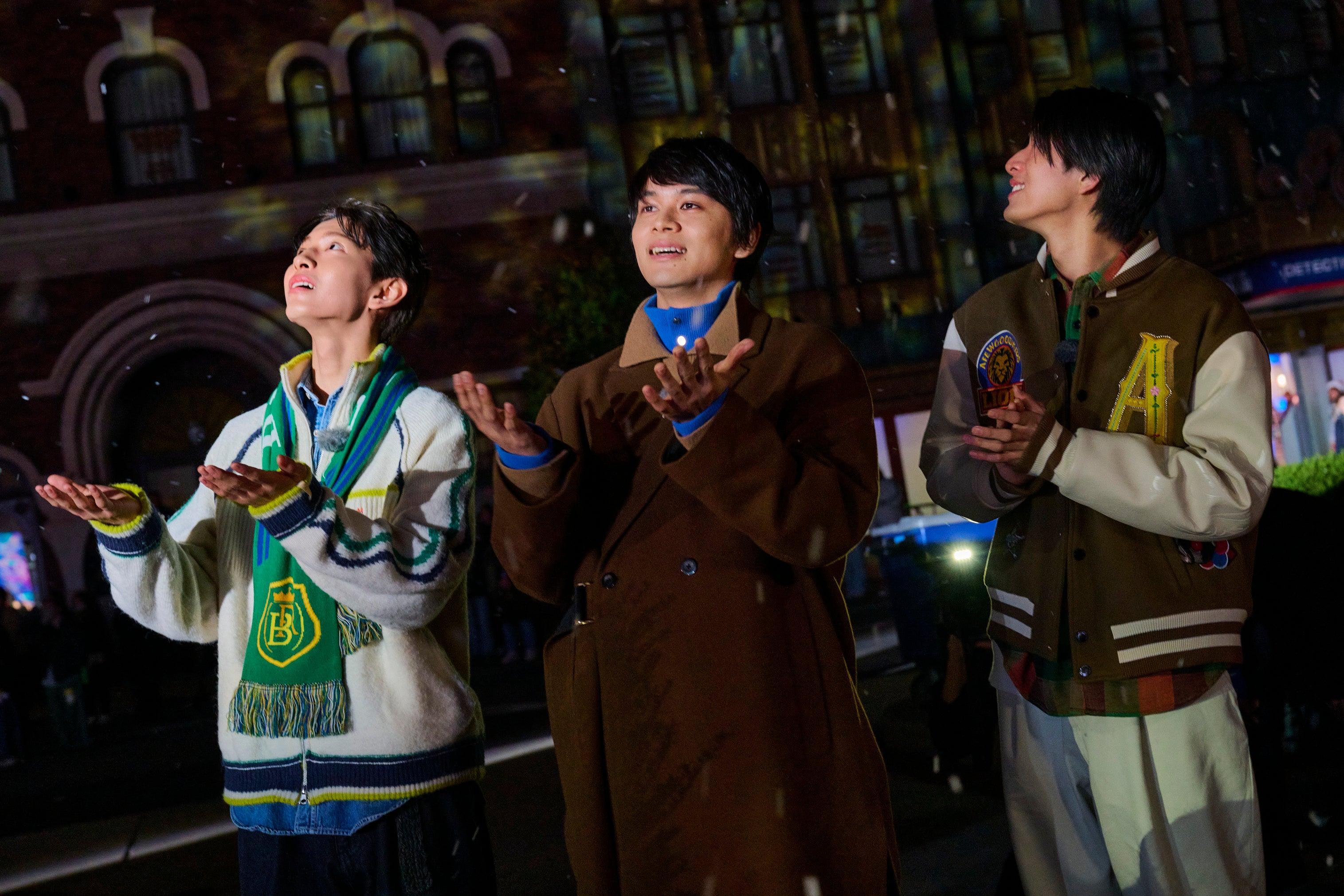 本日2025年11月18日(火)、『ユニバーサル・クリスマス・ジョイ』プレスプレビューを開催し、報道陣に初公開しました。オープニング・セレモニーには、ユニバーサル・スタジオ・ジャパンのブランドアンバサダー就任後、初のパーク公式訪問となる俳優の北村 匠海さんと同事務所の後輩であるダンスボーカルユニット「ICEx(アイス)」阿久根 温世(あくね はるせ)さん&竹野 世梛(たけの せな)さんが登場しました。北村さんは、「誰と過ごすかということももちろん大事だけど、クリスマスに自分自身を満たすということを、まさにここユニバーサル・スタジオ・ジャパンで感じてほしいです。食べたり、乗り物に乗ったり、そういうのも全部、自分がチョイスできる幸せなので、冬はぜひここに来て、“自分で自分を幸せにする”体験をしてほしいなと思います。」と、“超最幸”に自分自身を輝かせる新しいクリスマスの過ごし方を、ゲストの皆さまに向けて発信しました。