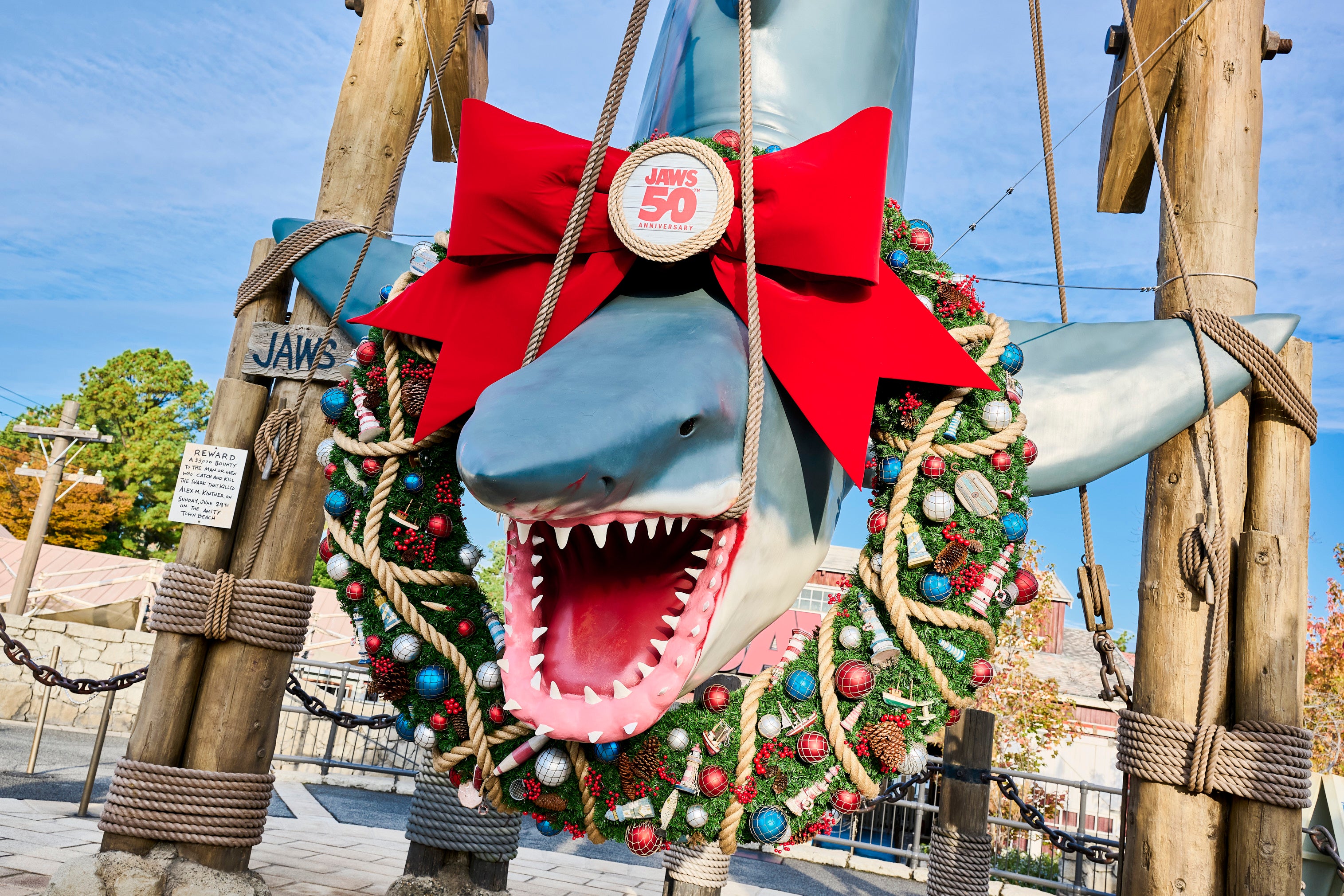 不朽の名作映画「ジョーズ」の日本での映画公開50周年(1975年12月6日初公開)を記念したアニバーサリー・イベント『ジョーズ・セレブレーション』【開催期間:11月19日(水)~2026年1月4日(日)】も、明日から開幕、パーク開業時から人気の『アミティ・ビレッジ』全体がお祝いムードにあふれます。50周年限定のクリスマス・リースが飾られたハンキング・シャークでの記念撮影や、アトラクション『ジョーズ』のボートツアーでの特別なアナウンス、テーマレストランのメニューリニューアルなど、パークだけの特別な「ジョーズ」の世界をゲストの皆さまは満喫しました。
