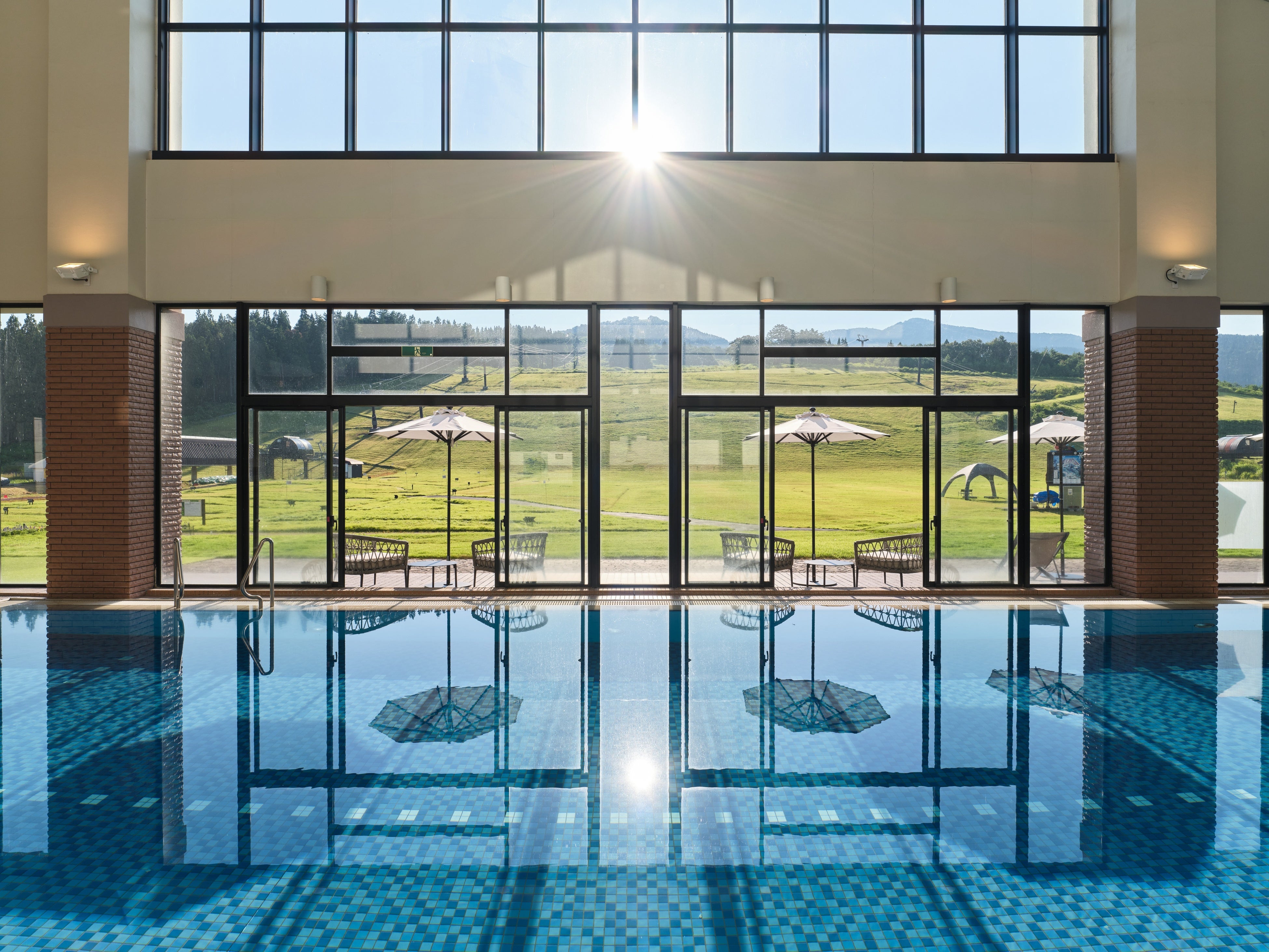 - 施設概要 レストラン、カフェラウンジ、露天風呂付き温泉大浴場、屋内プール、ロッカー、バーベキュー場、アクティビティ施設