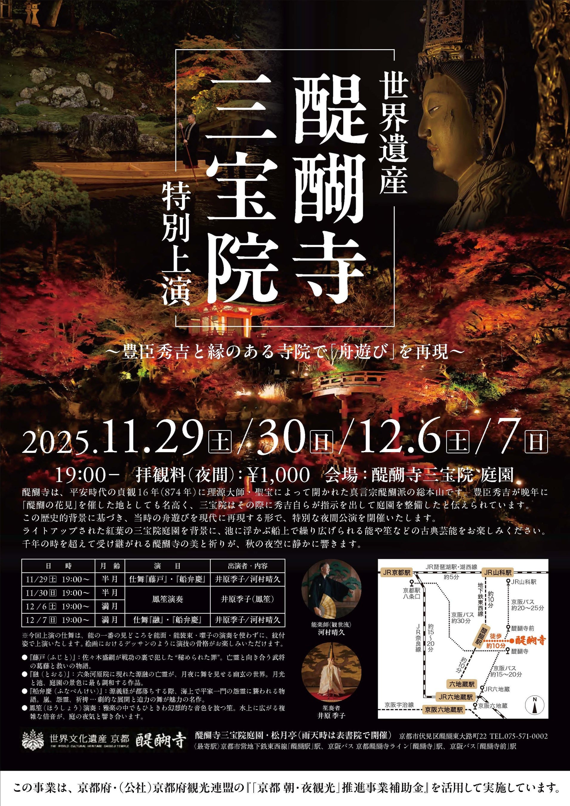 かつて三宝院で行われた「舟遊び」を現代に再現する試みであり、歴史・自然・芸能が溶け合う「世界遺産 京都・醍醐寺ならでは」の幽玄の世界をご体感いただけます。