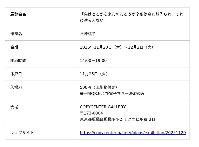 「COPYCENTER GALLERY」(東京・板橋)は、2025年11月20日(木)から12月2日(火)まで、谷崎桃子による個展「鳥はどこから来たのだろうか?私は鳥に魅入られ、それに逆らえない」を開催します。本展は、谷崎が2024年末に海辺の町へ移住したことをきっかけに制作を開始した、「鳥」をモチーフとする新シリーズの作品群で構成されます。