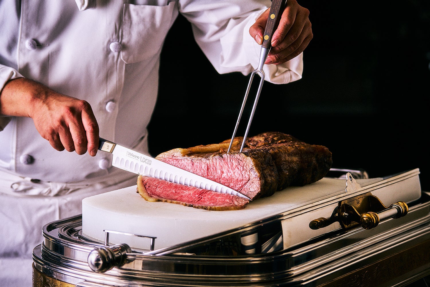 和・洋・中それぞれの料理が楽しめるディナーブッフェを、レストラン フォンタナとカフェレストラン テラスにて開催いたします。洋食では、サーモンの旨味を香ばしいパイで包んだ「トラウトサーモンのパイ包み焼きクリビヤック風」や、柔らかく煮込んだ牛肉と芳醇なソースの深い味わいが贅沢な「ビーフシチュー 温野菜添え」など、寒さが深まる季節にぴったりのシェフこだわりの料理をお楽しみいただけます。和食では、カニの旨味を閉じ込めた「カニ茶碗蒸し」、中国料理ではふかひれの滑らかな口あたりと深い旨みを味わえる「五目入りふかひれスープ」など、バラエティ豊かな料理をご用意しております。さらに、ゆっくりと時間をかけて丁寧に焼き上げた自慢の「国産牛のローストビーフ 和風ソース ポテトグラタン」は、お客様の目の前でお取り分けいたします。