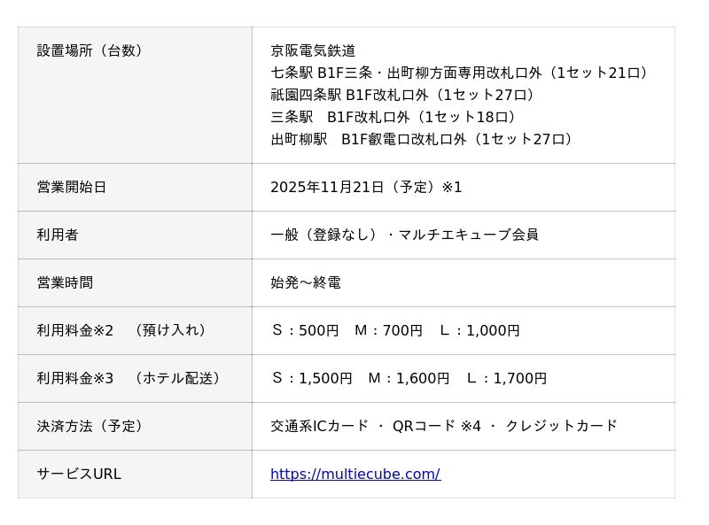 京阪ホールディングス株式会社(社長:平川 良浩、以下「京阪ホールディングス」)、京阪電気鉄道株式会社(社長:井上 欣也、以下「京阪電気鉄道」)と株式会社JR東日本スマートロジスティクス(代表取締役:市原 康史、以下「JR東日本スマロジ」)は、予約・キャッシュレス・多言語対応可能な多機能ロッカー『マルチエキューブ』を、京阪電気鉄道の京都市内の4駅(七条、祇園四条、三条、出町柳)に2025年11月21日(金)より設置いたします。