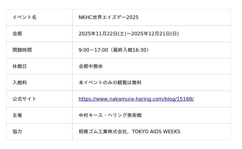 中村キース・ヘリング美術館(山梨県・小淵沢)は、世界エイズデー(毎年12月1日)に合わせて、HIV・エイズに対する予防啓発と正しい理解を深めることを目的としたイベント「中村キース・ヘリング美術館 世界エイズデー2025」(期間:2025年11月22日[土]~2025年12月21日[日])を開催します。今年新たに収蔵したキース・ヘリングのポスター作品「セーフ・セックス!」の初公開をはじめ、ヘリングの社会活動に関する資料展示やトークイベント映像の上映、コンドームの無料配布、HIV検査ディスペンサーの新設など多角的な企画を実施いたします。
