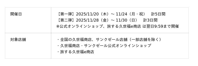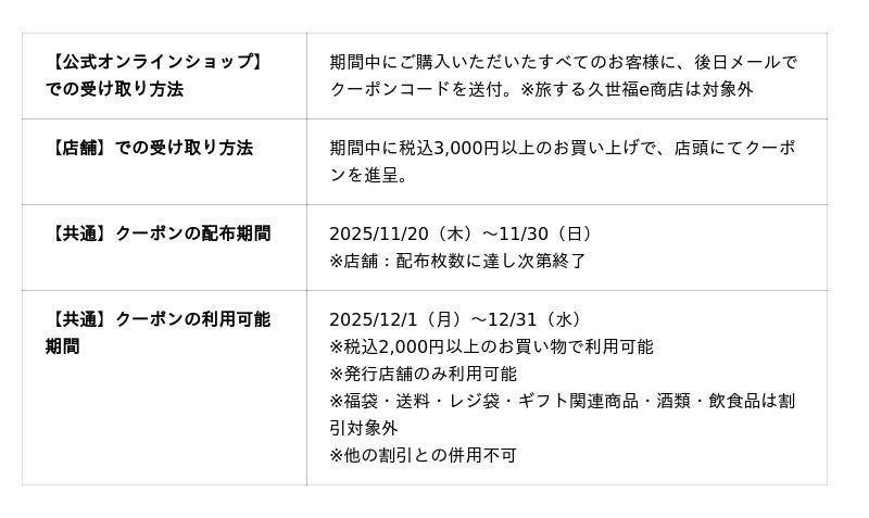 ブラックフライデー期間中、店舗・公式オンラインショップでお買い物いただいたお客様に、10%OFFクーポンをプレゼント。“日本のうまいもの”をもう一度お得に楽しめるチャンスを、どうぞお見逃しなく。