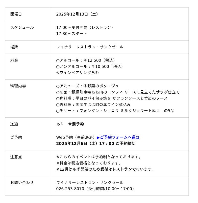株式会社サンクゼール(本社:長野県飯綱町)が運営するサンクゼールの丘から、ワインのディナーイベントのお知らせです。2025年12月13日(土)ワイナリーレストラン・サンクゼール(長野県飯綱町)において「ヴィニュロンたちの食卓 Vol.43 ~La Cheminee(ラ シュミネ)~」を開催いたします。