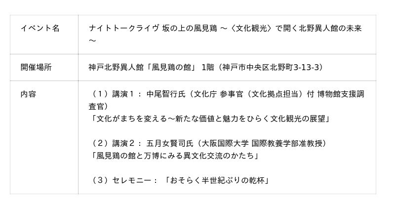 株式会社日比谷花壇(本社:東京都港区、代表取締役社長:宮島浩彰)は、当社が指定管理者として管理運営を行う神戸北野異人館「風見鶏の館」(所在地:兵庫県神戸市中央区北野町3-13-3)において、2025年11月2日(日)に、夜間特別イベントとしてナイトトークライヴ『坂の上の風見鶏~〈文化観光〉でひらく北野異人館の未来~』を開催いたしました。