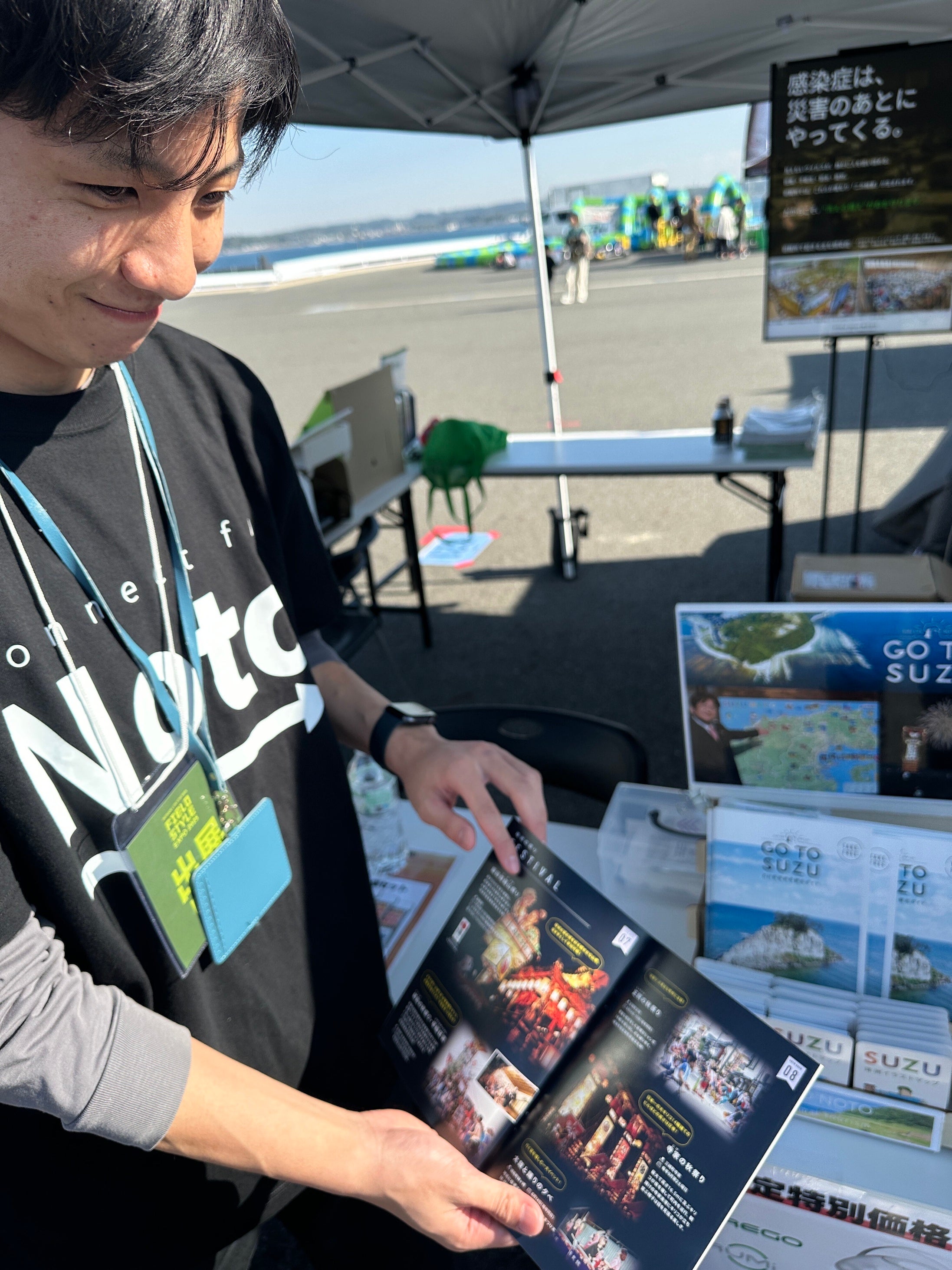 珠洲市観光交流課 田中課長さんよりお預かりした観光案内を配布し珠洲の魅力をお伝えしました。