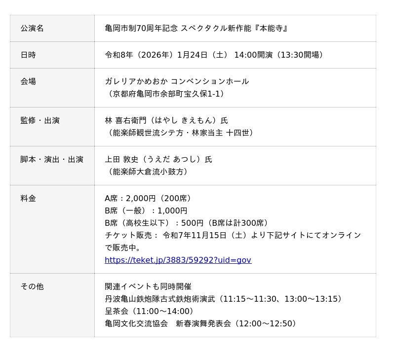 京都府亀岡市(市長:桂川孝裕)ら市内観光事業者等でつくる、亀岡光秀まつり実行委員会(実行委員長:奥村昌信)は、亀岡市制70周年記念事業とし、亀岡市の文化・芸術を発信するため、スペクタクル新作能『本能寺』を制作、令和8年1月24日(土)にガレリアかめおかで上演します。