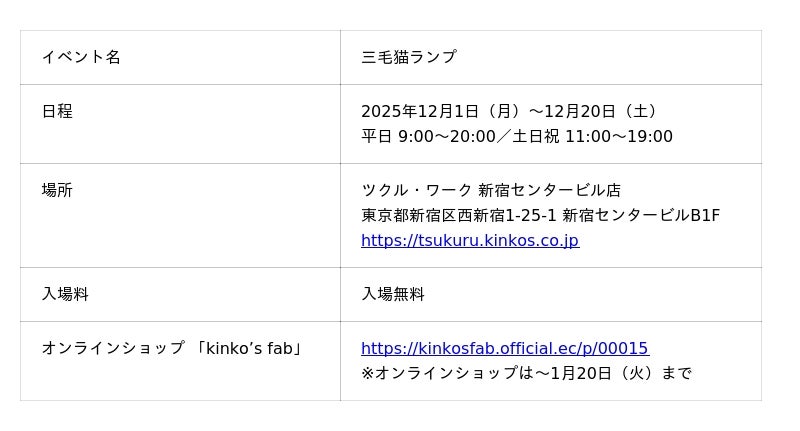 ツクル・ワークでは、テレワーク利用やビジネス機会の創出の場として利用されるコワーキングスペースの「ツクル」の利用者に、アーティスト作品との偶発的な出会い、働くだけではない“体験”・“感動”のできる空間を提供したいと考えています。また、参加アーティストには、ツクルを利用することで作品に対する思いや世界観までこだわった企画展を表現して欲しいと願っています。当社は、これからも企画展示を通じワークスペース事業の在り方についての可能性を追求していきます。キンコーズ・ジャパン株式会社 会社概要