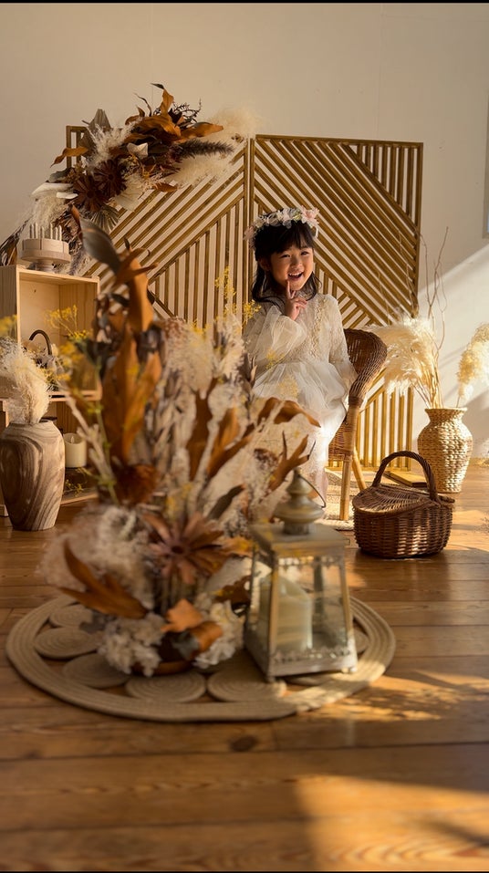 今回の撮影会は、家づくり企業であるマッケンジーハウスが地域と家族のつながりを深めるために企画した“体験ギフトプロジェクト”の一環です。スタジオにはドライフラワーやウッドアイテムを使用した特別な世界観を設置し、柔らかい光が差し込む空間で、プロカメラマンが家族の自然な表情を撮影しました。