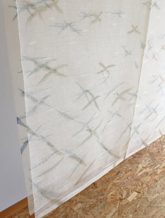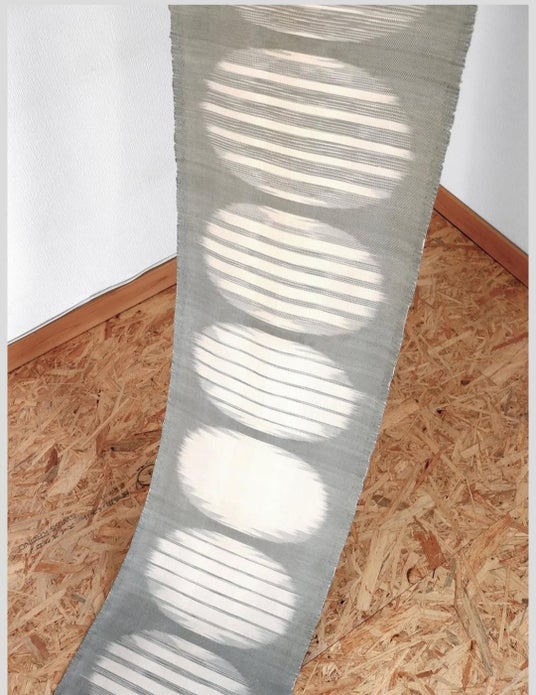 分けた糸を用いて文様を織り出す伝統的な絣織技法を扱い、その手法の制約の中で