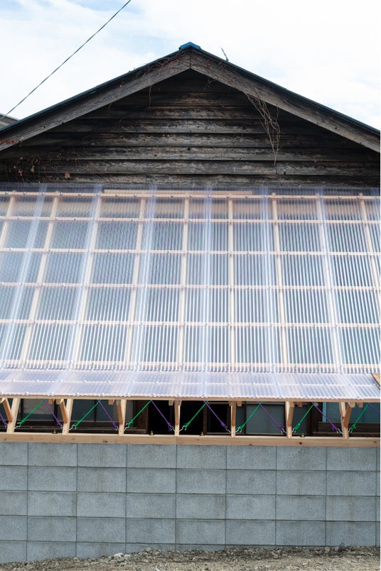 長らく廃屋となっていた九小前の機織り工場。昔の人のつくると暮らすが一体となっていたこの廃屋を壊れないよう保全する。会期後のさらなる保全のため、屋内の床や間仕切りは解体して砂利敷きとし、展示空間とする。通り側の下屋はリニューアルし、バットレス的に小屋をささえる架構をつくる。この木の架構はキャンプロープを編むように筋交いをつくっている。半世紀近いタイムラグを経て、再び繊維の力が建物を支える。(TATTA 富永大毅、藤間弥恵)