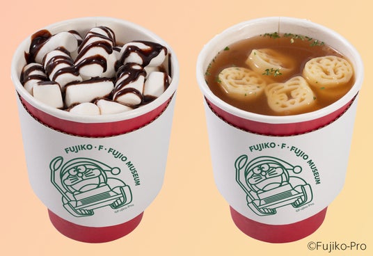 ミニマシュマロがたくさんのったココアやドラえもんパスタ入りのコンソメスープです。