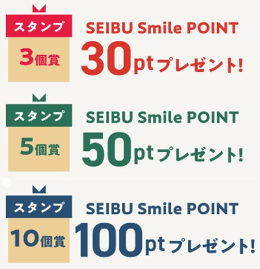 施設内の異なる店舗でお買い物をしてスタンプを集めると、「SEIBU Smile POINT」最大100ポイントをもれなくプレゼント!
