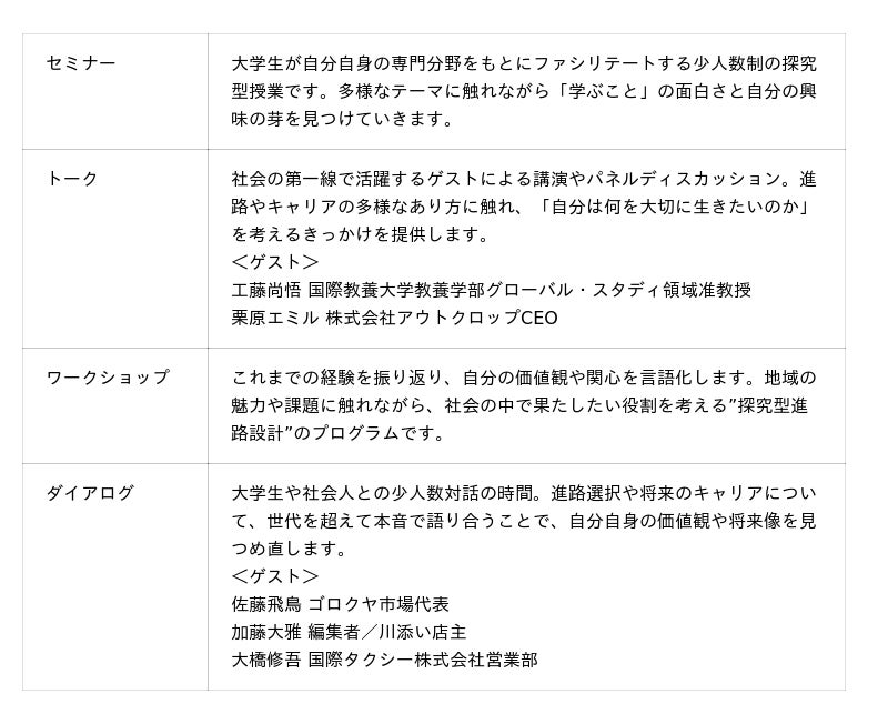 プログラムでは、秋田市内の大学生(国際教養大学、秋田大学、秋田公立美術大学)や留学経験者に加え、起業家・教育関係者・クリエイターなど多彩な社会人ゲストを迎えます。異なる分野の先輩たちとの対話を通じて、「大学で学ぶこと」や「社会で働くこと」をリアルに感じ、自分の未来を描く時間を作ります。