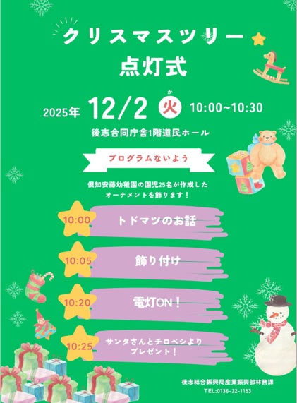 北海道後志総合振興局では、12月2日(火)から12月25日(木)まで、後志合同庁舎1階道民ホールにてクリスマスツリーの展示を行います。この催しは、子ども達に地元産の木材に親しんでもらうため、2008年から毎年実施しており、今年のクリスマスツリーには共和産の高さ4mのトドマツ材を使用します!