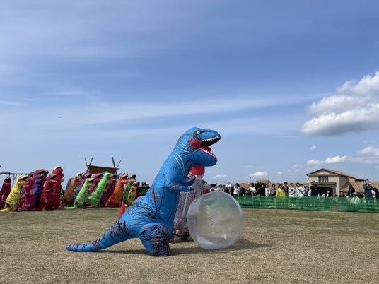 レース会場は、ソレイユの丘が誇る広大な芝生が魅力の「のんびりはらっぱ」。参加者は、恐竜の姿で柔らかな芝生の上を全力で駆け抜けるという、ここだけの爽快感を味わうことができます。