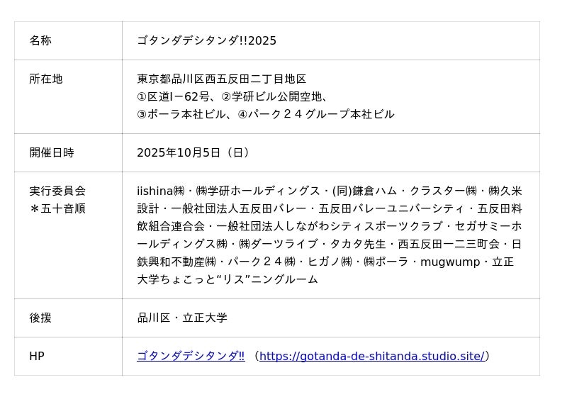 「ゴタンダデシタンダ!!」は道路空間や公開空地などの公共空間利活用の社会実験ならびに産官学さまざまな団体の連携・共催による地域貢献活動として2023年度より開催しており、今年度で3回目となります。また、地域で開催されている雉子神社 例大祭及び例大祭に付帯して開催される地元町会のお祭りとあわせて本イベントを実施し、エリア一体でのにぎわいの創出につき相乗効果を生み出しています。