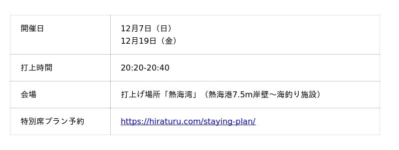 【冬空に咲く大輪の華】年末年始は熱海温泉へ!12月の熱海海上花火大会は7日(日)・19日(金)特等席確約の送迎付きプランの販売中。空席少なくなっているので、ご予約はお早めに!
