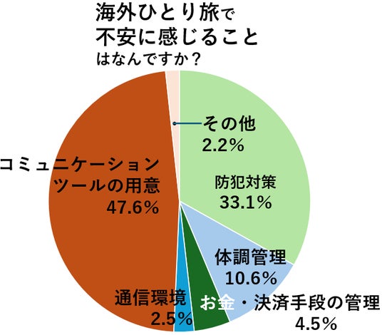 海外ひとり旅は未経験だが興味はあると回答した人に、「海外ひとり旅で不安に感じることは?」という質問をしたところ、もっとも多かったのは「コミュニケーションツールの用意」という回答で47.6%の人がそう答えました。海外ひとり旅経験者の「もっとも気を付けていること」という質問中では3.8%の回答だっただけに、コミュニケーションについては、実際に行ってみるのと行く前では大きく印象が違うのかもしれません。(n=357)